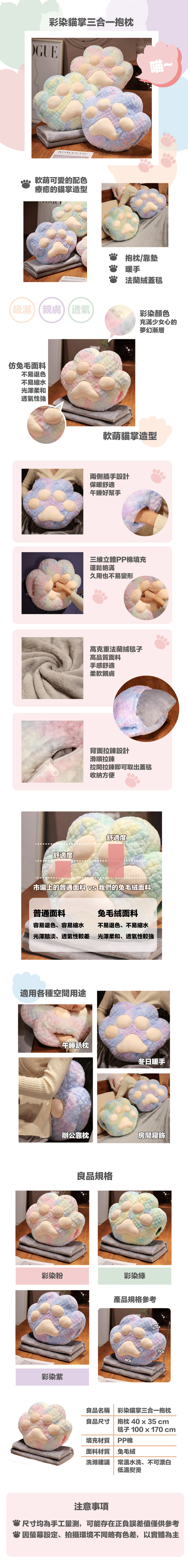 彩染貓掌三合一抱枕